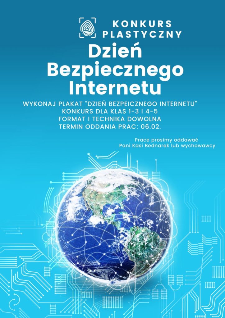 Serdecznie zapraszamy uczniów z klas 1️⃣-5️⃣ do wzięcia udziału w konkursie plastycznym z okazji zbliżającego się „𝗗𝗻𝗶𝗮 𝗕𝗲𝘇𝗽𝗶𝗲𝗰𝘇𝗻𝗲𝗴𝗼 𝗜𝗻𝘁𝗲𝗿𝗻𝗲𝘁𝘂”💻🖥🖱. Szczegóły dotyczące konkursu znajdują się na plakacie poniżej⤵️