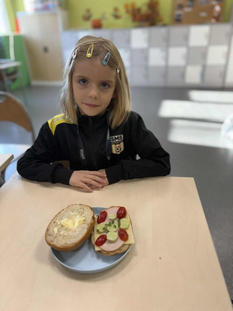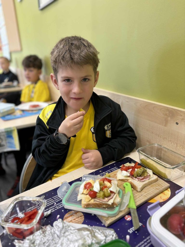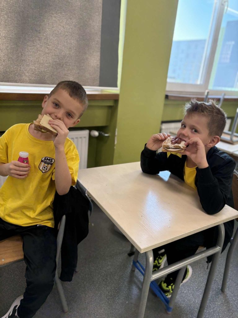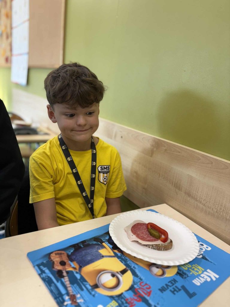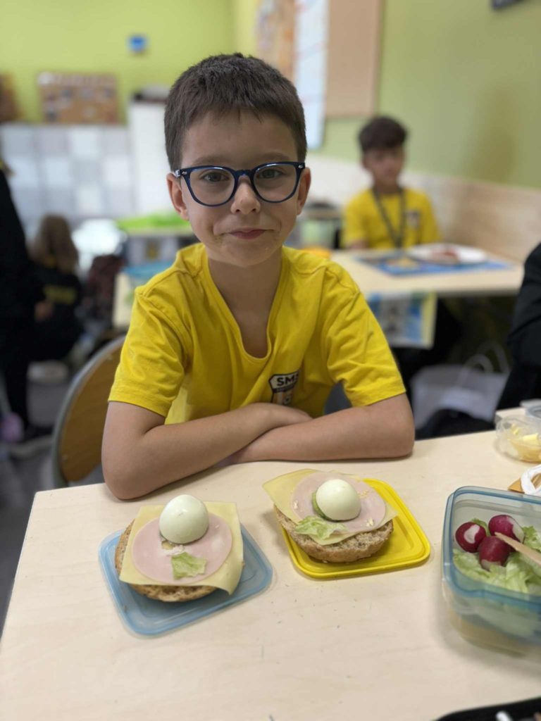 W klasie Ia odbył się Dzień Zdrowego Śniadania 🥣, którego celem było promowanie prawidłowych nawyków żywieniowych 🥗 oraz przypomnienie, jak ważne jest codzienne spożywanie pożywnego posiłku o poranku 🌞. Podczas zajęć dzieci samodzielnie przygotowywały swoje śniadania z przyniesionych produktów 👩🍳👨🍳. Na stołach nie zabrakło pełnoziarnistego pieczywa 🍞, świeżych warzyw 🥕🥒, serów 🧀 i jajek 🥚. Uczniowie z ogromnym zaangażowaniem i radością 😍 komponowali kolorowe, zdrowe kanapki 🥪, ucząc się przy tym samodzielności 💪, współpracy 🤝 i dokonywania mądrych wyborów żywieniowych 🍏.