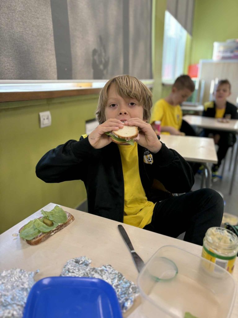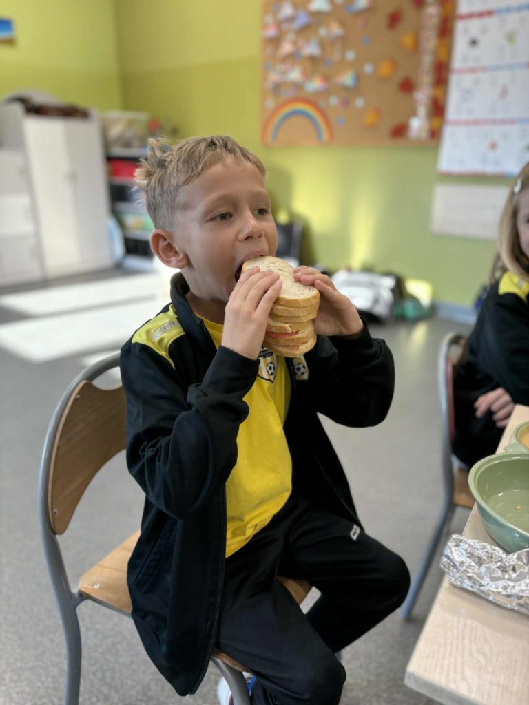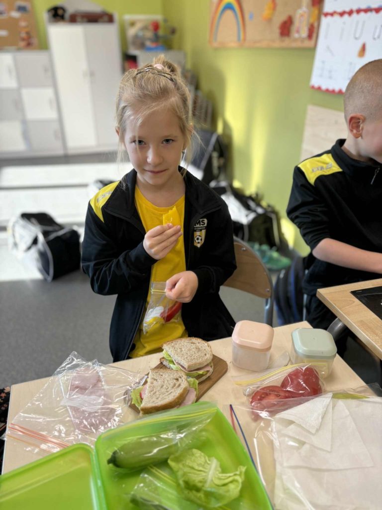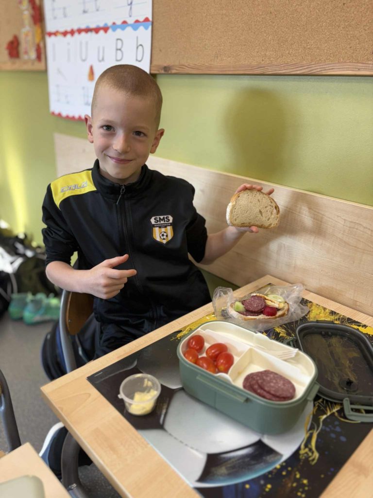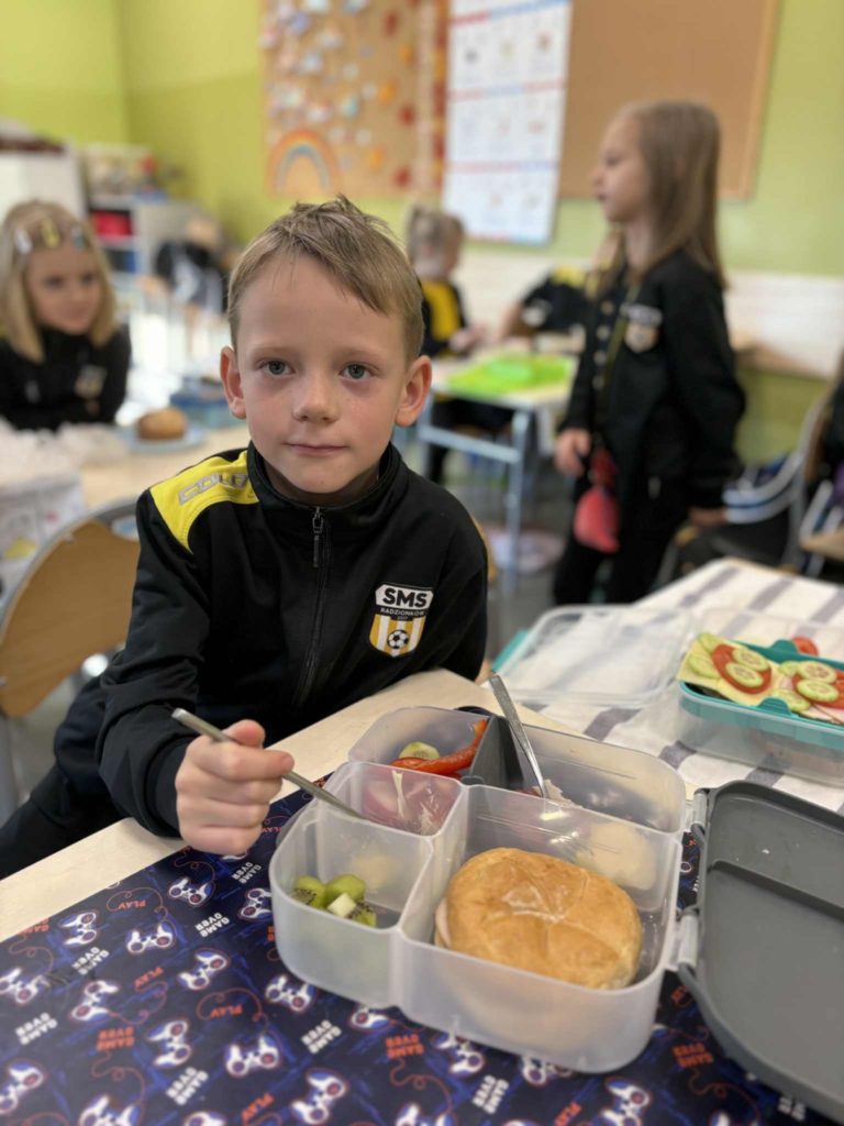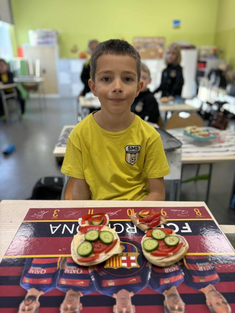W klasie Ia odbył się Dzień Zdrowego Śniadania 🥣, którego celem było promowanie prawidłowych nawyków żywieniowych 🥗 oraz przypomnienie, jak ważne jest codzienne spożywanie pożywnego posiłku o poranku 🌞. Podczas zajęć dzieci samodzielnie przygotowywały swoje śniadania z przyniesionych produktów 👩🍳👨🍳. Na stołach nie zabrakło pełnoziarnistego pieczywa 🍞, świeżych warzyw 🥕🥒, serów 🧀 i jajek 🥚. Uczniowie z ogromnym zaangażowaniem i radością 😍 komponowali kolorowe, zdrowe kanapki 🥪, ucząc się przy tym samodzielności 💪, współpracy 🤝 i dokonywania mądrych wyborów żywieniowych 🍏.