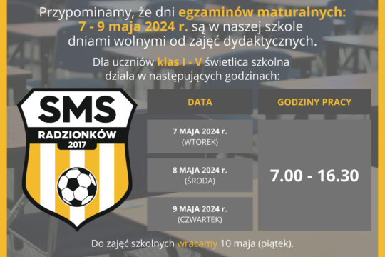 Przypominamy, że dni 7️⃣ – 9️⃣ maja 2024 r., ze względu na egzaminy maturalne🧑🎓, są w naszej szkole dniami wolny...