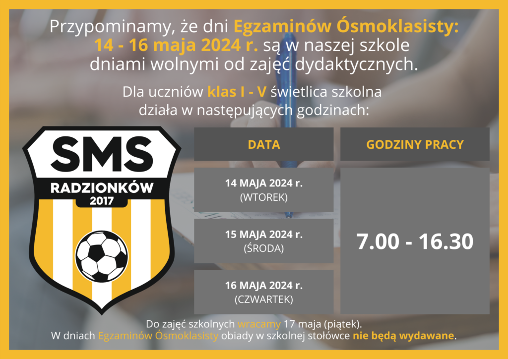 Przypominamy, że dni 1️⃣4️⃣ – 1️⃣6️⃣ maja 2024 r., ze względu na Egzamin Ósmoklasisty🧑🎓, są w naszej szkole dniami wolnymi od zajęć dydaktycznych. Dla uczniów klas 1️⃣-5️⃣ zapewniamy opiekę świetlicową🔽: