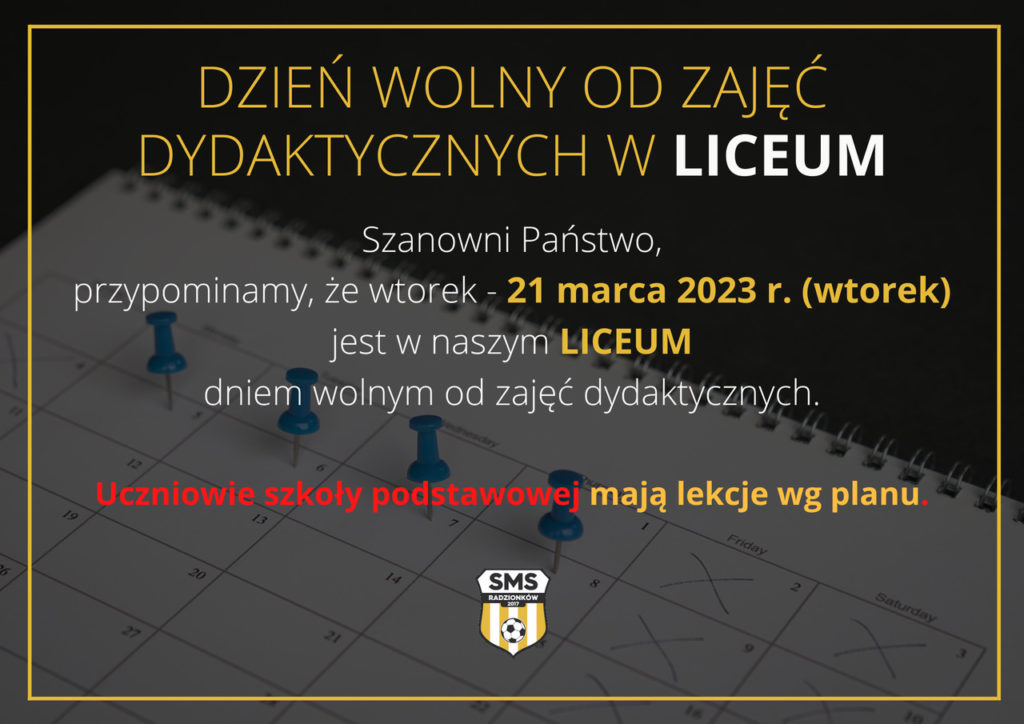 SMS DEV R > Blog > Informacje > Dzień wolny od zajęć dydaktycznych w LICEUM🧑‍🏫 – 2️⃣1️⃣ marca 2023 r. ⤵️