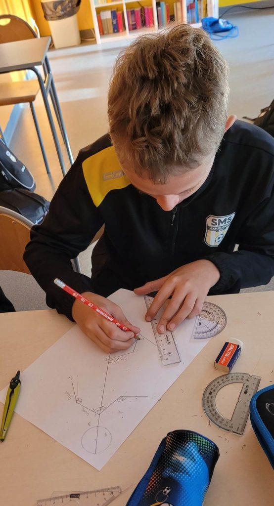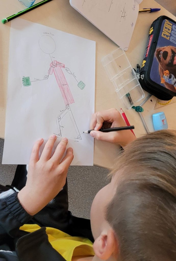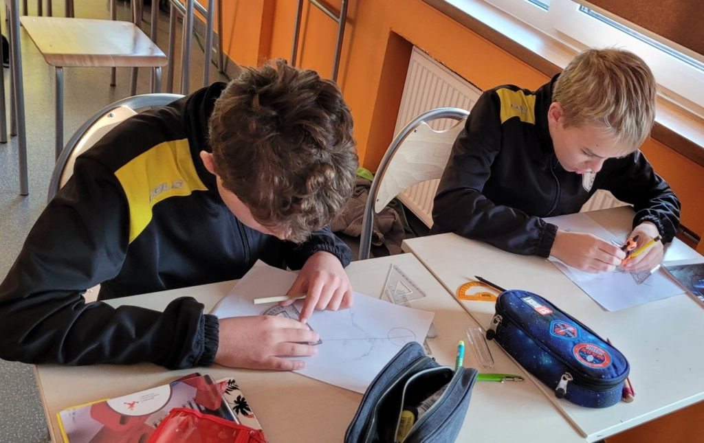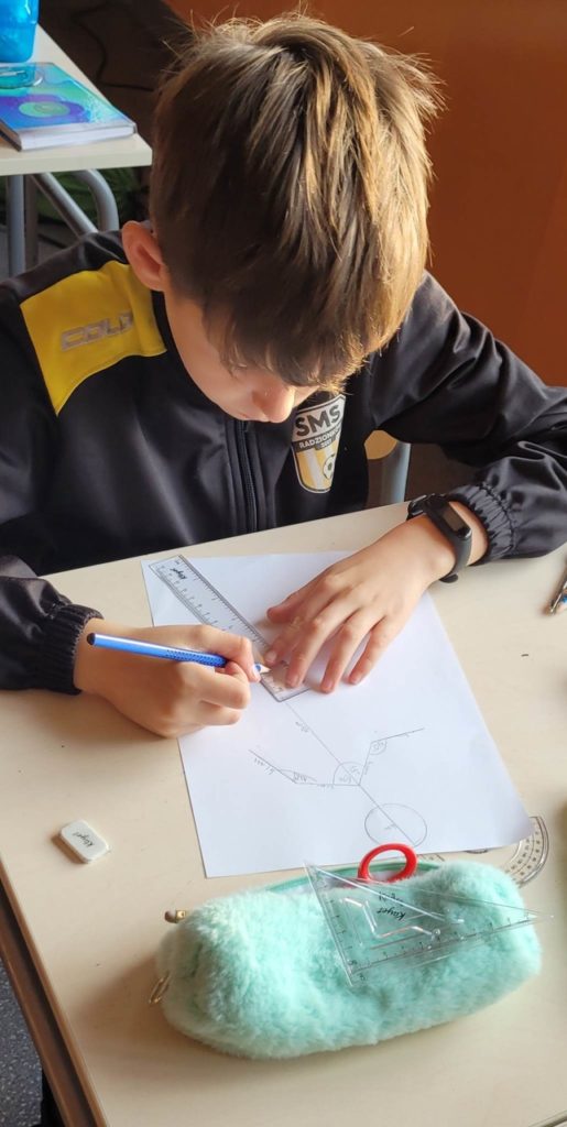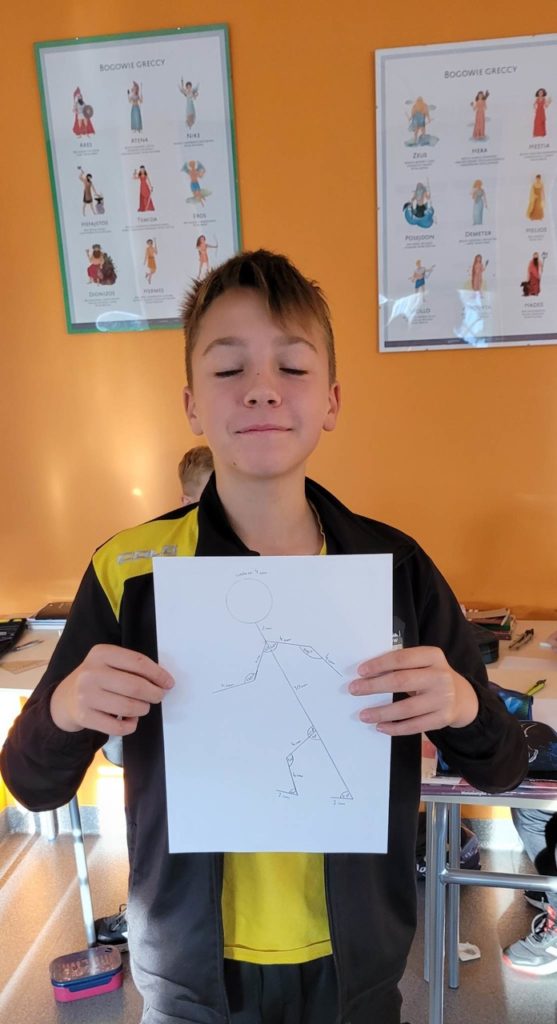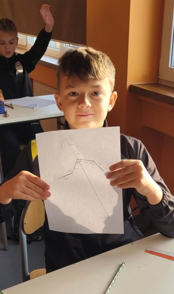 Na podsumowującej lekcji o ķątach uczniowie klasy VI szlifowali umiejętność posługiwania się przyrządami geometrycznymi 📐📏. Chłopcy mieli za zadanie narysować „Patyczaka” zgodnie z instrukcją📝, którą otrzymali. Po wykonaniu zadania powstałą postać mogli przekształcić w dowolnego ludzika 🙂. Zadanie do najłatwiejszych nie należało, ale nasi uczniowie poradzili sobie z nim doskonale, zresztą zobaczcie sami💁♂️!