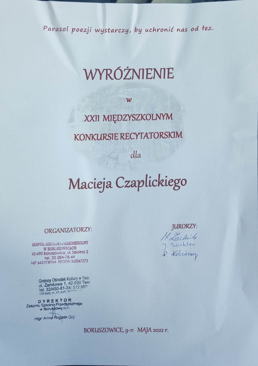 🏅 wyróżnienie w kategorii klas I – III: MACIEJ CZAPLICKI;