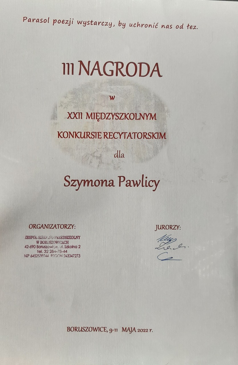 W dniach 10 – 11 maja 2022 r. reprezentacja naszej szkoły klas I – VI udała się na „XXII Międzyszkolny Konkurs Recytatorski” do Boruszowic. Konkurencja była niezwykle wysoka, tym bardziej cieszy fakt, że uczniowie SMS-u pokazali się z bardzo dobrej strony zdobywając: