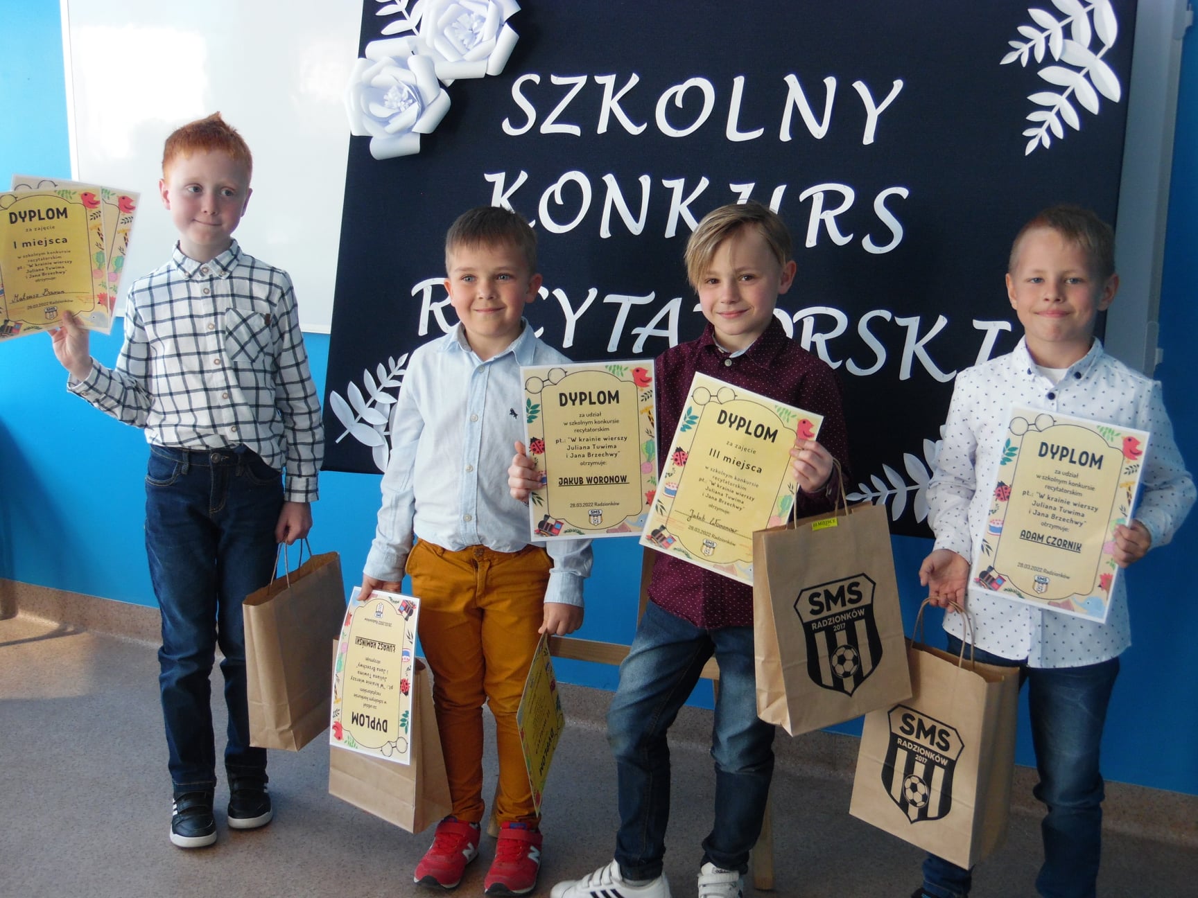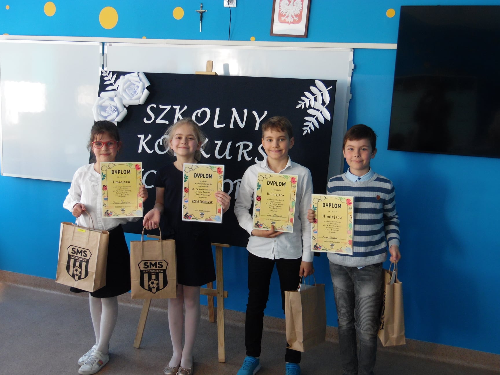 28 marca 2022 r. odbył się „Konkurs recytatorski poezji J. Tuwima i J. Brzechwy klas I – II”. Chociaż uczestnicy stresowali się ogromnie, przygotowali bardzo długie wiersze, które w przepiękny sposób zaprezentowali przed jury w składzie: p. K. Bednarek, p. M. Pozimska i p. H. Blacha. Po długich obradach jurorów udało się wyłonić zwycięzców w każdej kategorii, którzy w nagrodę otrzymali książki oraz gry planszowe. Każdy z uczestników otrzymał także pamiątkowy dyplom. Serdecznie gratulujemy wszystkim naszym najmłodszym uczniom, a poniżej prezentujemy listę laureatów🥳🤩
