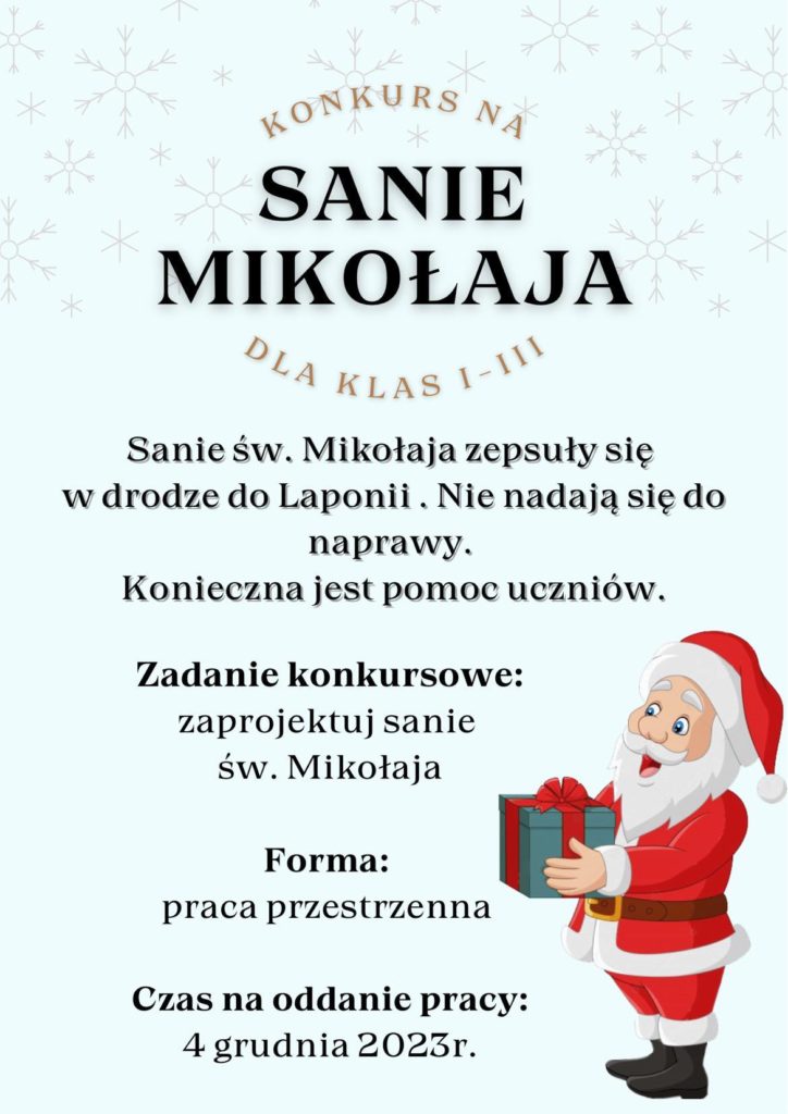 Święty Mikołaj zepsuły się sanie…🥺! Pomóż mu je naprawić!🙏 Serdecznie zachęcamy uczniów klas 1️⃣ – 3️⃣ do wzięcia udziału w „Mikołajkowym Konkursie Plastycznym”🎅🔽
