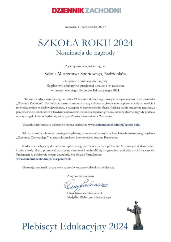 W „Dzień Edukacji Narodowej” dotarła do naszej placówki niezmiernie miła informacja o nominacji naszego SMS-u w 𝗣𝗹𝗲𝗯𝗶𝘀𝗰𝘆𝗰𝗶𝗲 𝗘𝗱𝘂𝗸𝗮𝗰𝘆𝗷𝗻𝘆𝗺 „Dziennika Zachodniego” w kategorii „𝗦𝘇𝗸𝗼ł𝗮 𝗥𝗼𝗸𝘂 𝟮𝟬𝟮𝟰”. Serdecznie dziękujemy za nominację 💛🖤💛! 🔝
