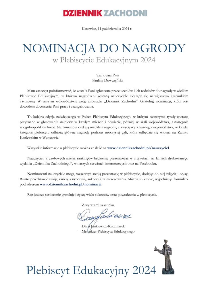 Gratulacje także dla 𝗽. 𝗣𝗮𝘂𝗹𝗶𝗻𝘆 𝗗𝗼𝘄𝗰𝘇𝘆𝗻́𝘀𝗸𝗶𝗲𝗷 – nauczycielki j. angielskiego oraz informatyki, która już drugi raz z rzędu otrzymała nominację w kategorii „𝗡𝗮𝘂𝗰𝘇𝘆𝗰𝗶𝗲𝗹 𝘀𝘇𝗸𝗼ł𝘆 𝗽𝗼𝗻𝗮𝗱𝗽𝗼𝗱𝘀𝘁𝗮𝘄𝗼𝘄𝗲𝗷”. Trzymamy kciuki za wysokie miejsca! 👏✊