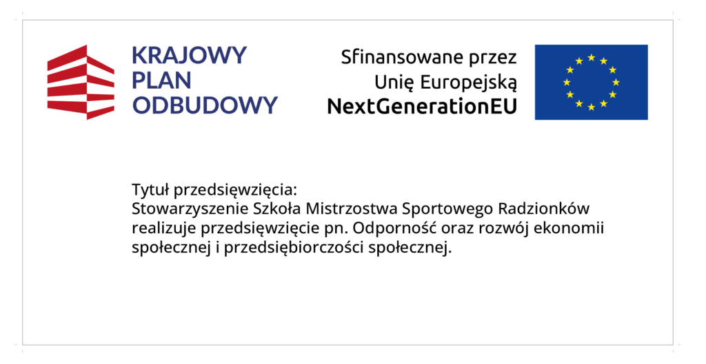 Stowarzyszenie Szkoła Mistrzostwa Sportowego Radzionków jest beneficjentem programu KPO MRiPS pn. „ Odporność oraz rozwój ekonomii społecznej i przedsiębiorczości społecznej” na lata 2022-2025.