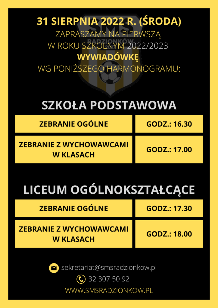 Serdecznie zapraszamy na pierwsze w roku szkolnym 2️⃣0️⃣2️⃣2️⃣/2️⃣0️⃣2️⃣3️⃣ zebranie z rodzicami, które odbędzie się w SMS Radzionków wg poniższego harmonogramu 👇:
