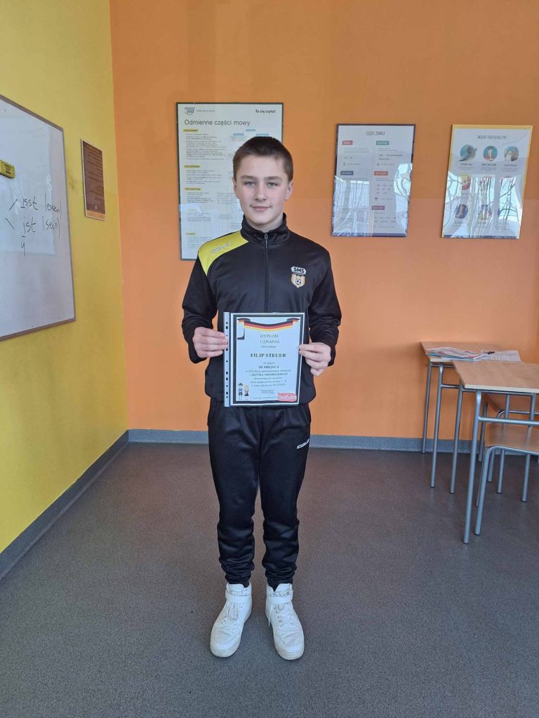 Z radością informujemy, że 𝐅𝐈𝐋𝐈𝐏 𝐒𝐓𝐄𝐔𝐄𝐑 – uczeń klasy 7️⃣ naszego SMS-u, który w listopadzie brał udział w „XII edycji Ogólnopolskiej Olimpiady z Języka Niemieckiego” organizowanej przez Olimp School z Łodzi, uplasował się na podium, zajmując wysokie 🥉 miejsce (na 160 uczestników z całego kraju🤩). W pierwszej dziesiątce znaleźli się także: Łukasz Pławecki, Fabian Wojtacha oraz Adam Niżewski, którzy uzyskali kolejno 5️⃣., 7️⃣., oraz 9️⃣. lokatę.