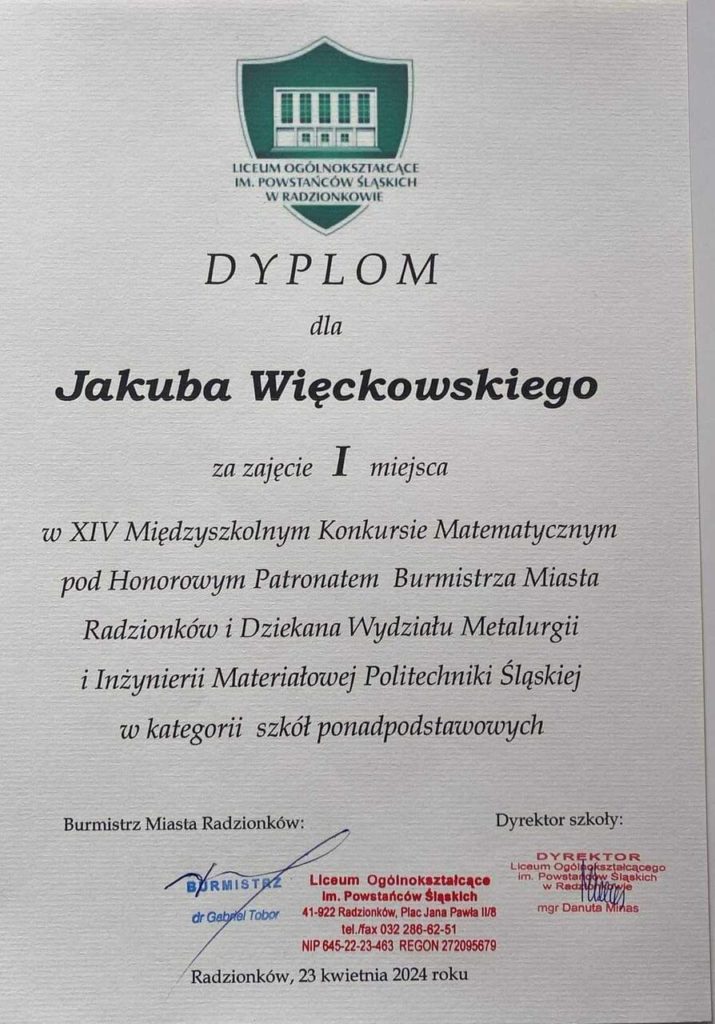🥇 miejsce – Jakub Więckowski z klasy IV LO