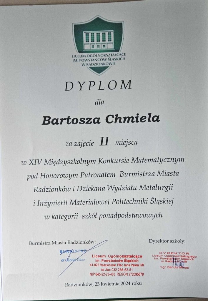 🥈 miejsce – Bartosz Chmiel z klasy IV LO