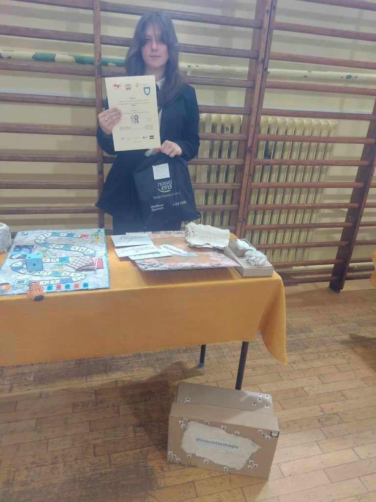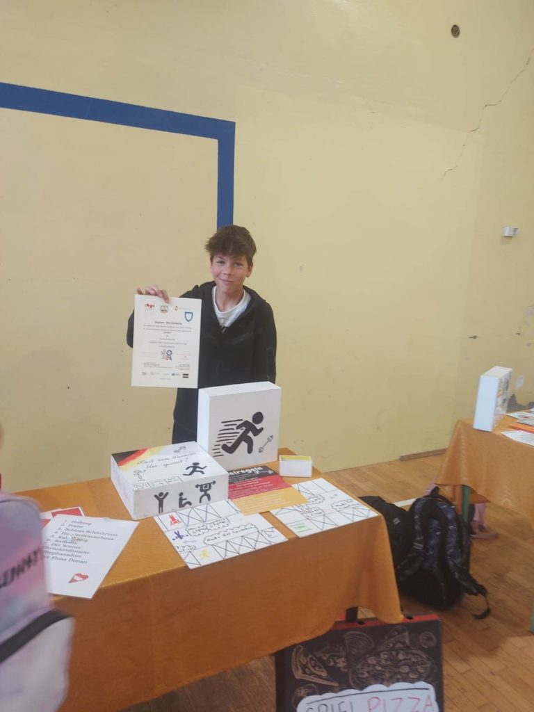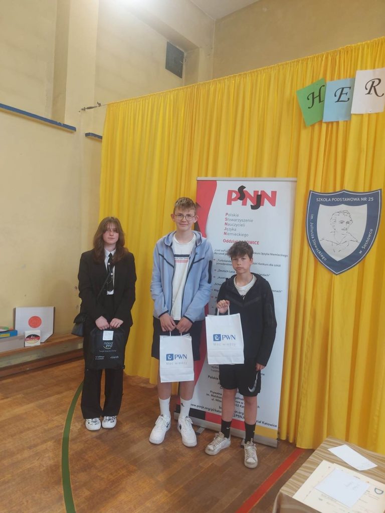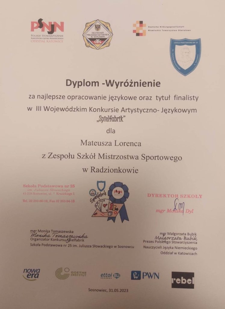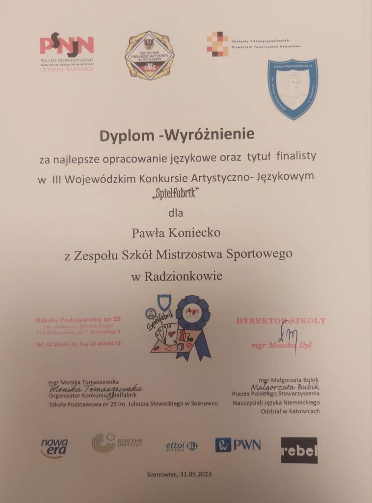 3️⃣1️⃣ maja 2023 r. uczniowie naszego SMS-u: Maja Wlazły, Paweł Koniecko oraz Mateusz Lorenc uczestniczyli w finale 3️⃣ Wojewódzkiego Konkursu Artystyczno-Językowego „Spielfabrik”🎲na grę planszową/karcianą z języka niemieckiego🇩🇪, który odbył się w Szkole Podstawowej nr 25 w Sosnowcu. Już sam fakt, że do ścisłego finału zakwalifikowały się wszystkie gry naszych sportowców był ogromnym sukcesem, zwłaszcza, że w konkursie brało udział prawie 30 szkół z całego województwa śląskiego. Wysoki poziom gier🎲 stworzonych przez uczniów SMS-u został doceniony przez jury konkursu.
