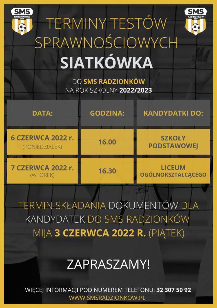 Poniżej przedstawiamy terminy testów sprawnościowy dla KANDYDATEK do SMS Radzionków (siatkówka 🏐) 👇. Przypominamy, że do 3️⃣ czerwca można składać dokumenty rekrutacyjne w tej dyscyplinie sportu zarówno do szkoły podstawowej jak i liceum ogólnokształcącego 🔝