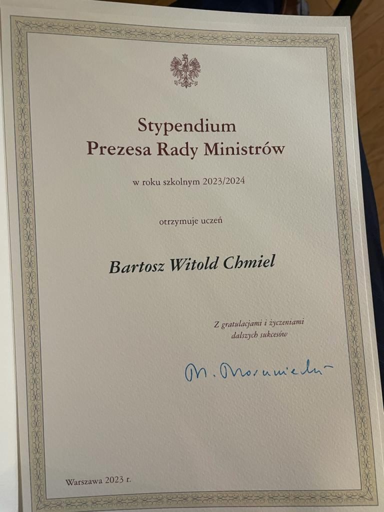 1️⃣2️⃣ października 2023 r. w Państwowych Szkołach Budownictwa w Bytomiu odbyło się uroczyste wręczenie dyplomów📜 Prezesa Rady Ministrów dla uczniów szkół delegatury bytomskiej. Bardzo miło jest nam oznajmić, że jednym ze stypendystów tej prestiżowej nagrody jest nasz tegoroczny maturzysta BARTOSZ CHMIEL. Bartkowi serdecznie gratulujemy i życzymy dalszych sukcesów!👏