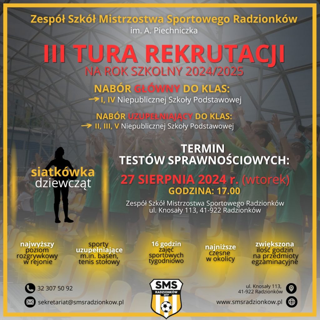 Wszystkie chętne dziewczynki👧👩🦱 do klas 1️⃣ – 5️⃣ szkoły podstawowej chcące spróbować swoich sił w 𝗝𝗘𝗗𝗬𝗡𝗘𝗝 𝗦𝗭𝗞𝗢𝗟𝗘 𝗠𝗜𝗦𝗧𝗥𝗭𝗢𝗦𝗧𝗪𝗔 𝗦𝗣𝗢𝗥𝗧𝗢𝗪𝗘𝗚𝗢 𝗪 𝗣𝗢𝗪𝗜𝗘𝗖𝗜𝗘 𝗧𝗔𝗥𝗡𝗢𝗚𝗢́𝗥𝗦𝗞𝗜𝗠 zapraszamy na III turę testów sprawnościowych z siatkówki🏐🔝 już we wtorek 2️⃣7️⃣ sierpnia 2024 r.