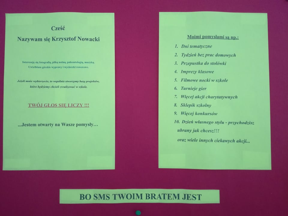 Wybory do Samorządu Uczniowskiego rozstrzygnięte! Po burzliwej kampanii wyborczej i emocjonującym głosowaniu, przyszedł czas na niecierpliwie wyczekiwane ogłoszenie wyników 😊 Miejsce I zajęła, a tym samym objęła stanowisko przewodniczącej SU, Marlena Kuźniak 👏 Miejsce II – Adam Olszowski 👏 Miejsce III – Wiktoria Soremska i Krzysztof Nowacki 👏 Gratulujemy i życzymy owocnego urzędowania!