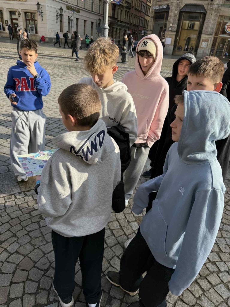Pierwszego dnia uczniowie odkrywali zakamarki wrocławskiego Rynku w nietypowy sposób – podczas gry terenowej z elementami rywalizacji 💪📱. Z wykorzystaniem kodów QR zwiedzanie stało się nie tylko ciekawe, ale też bardzo angażujące i pełne emocji! 🔍🎯