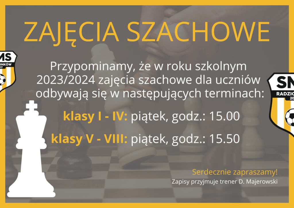Zapraszamy wszystkich chętnych uczniów na zajęcia szachowe♟🤩. Szczegóły na plakacie poniżej ⤵️